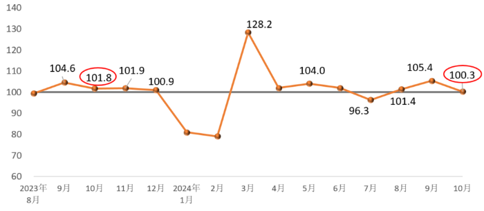 In October 2024, the Prosperity Index of Construction Materials Industry was 100.3 points, down 5.1 points from September, 1.5 points lower than the same month of the previous year, slightly above the critical point, in the weak prosperity zone, and the industry's economic operation remained stable.